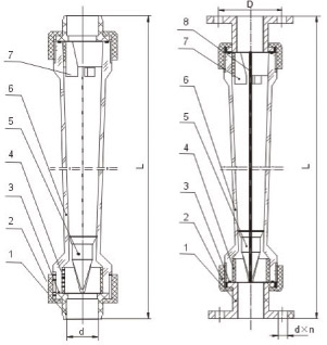 LZT-S塑料浮子流量計主要部件:錐管材料AS,浮子材料(ABS),插管連接(PVC),外螺紋連接尼龍(PA6),內螺紋連接尼龍(PA66)。